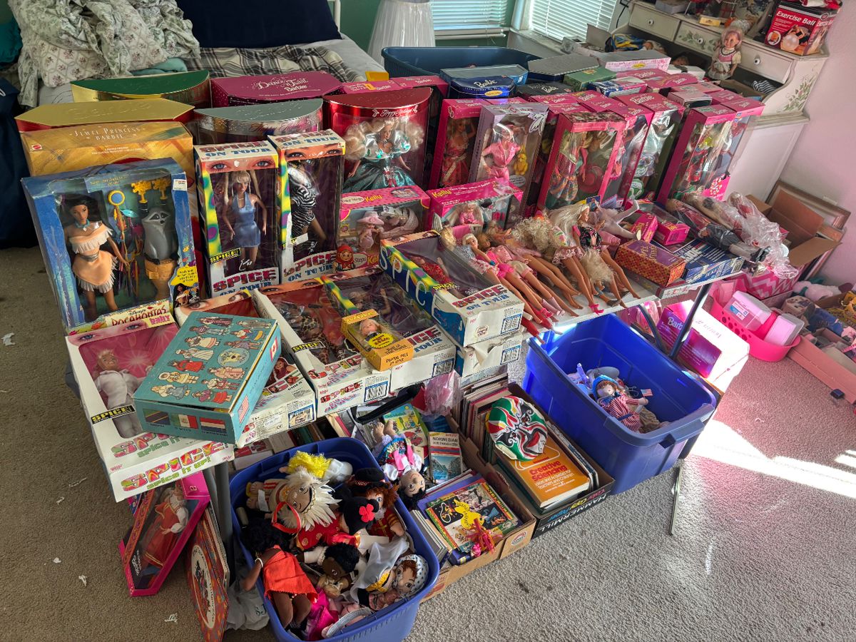 tons of teacher supplies, books, holiday decor, Christmas, Easter, Halloween, st Patrick’s day, etc, huge Barbie collection, dolls, clothing, household items, Star Wars, gi joe, tmnt, hot wheels, nasa, records and so much more!  Come back and shop this sale!