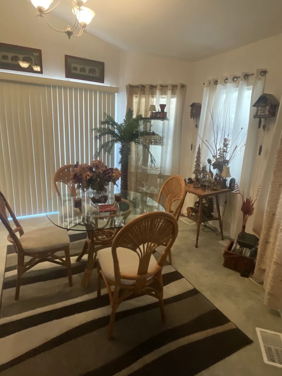 Home with collectibles, electric Reclining couch and love seat, dining table, curio cabinets, full kitchen, master closet, tools, garage boxes AND MORE.