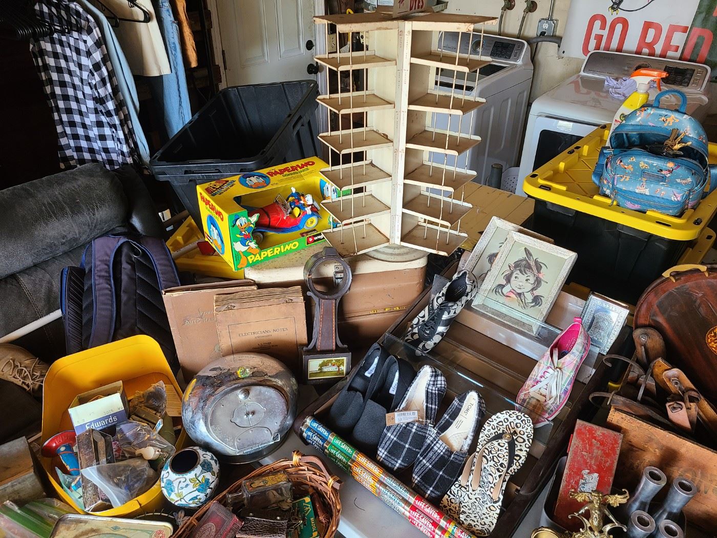 SOME OF THE ITEMS/GENRES THAT WE HAVE DISCOVERED SO FAR ARE THE FOLLOWING: VINTAGE AND ANTIQUE.....{AND SOME MODERN LIKE POTTERY BARN/ETC....) TOYS PRIMITIVES LOTS OF LITTLES HOUSEHOLD/DECOR EMPHEMERA JEWELRY/ADVERTISING DISPLAYS PURSES/BAGS CLOTHES BOOKS METAL YARD ART/ITEMS RECORD PLAYER(DEFINITELY OLD) PEDAL CAR LIFESAVER DISPLAY DYE DISPLAY SANITIZER CABINET (SMALL) OLD WOODEN REGISTER LOTS OF SMALLS, ETC...ETC...ETC... THERE IS JUST ALOT OF STUFF.... GOAL IS TO GET RID OF EVERYTHING BROWSE THROUGH THE PICTURES, YOU WILL UNDERSTAND...ITEMS WERE MOVED TO THIS LOCATION FOR SALE, HOWEVER, REMEMBER, WE ONLY HAVE ACCESS TO SMALL AREA TO HOLD THE SALE SHOP LIFTING WILL NOT BE...
