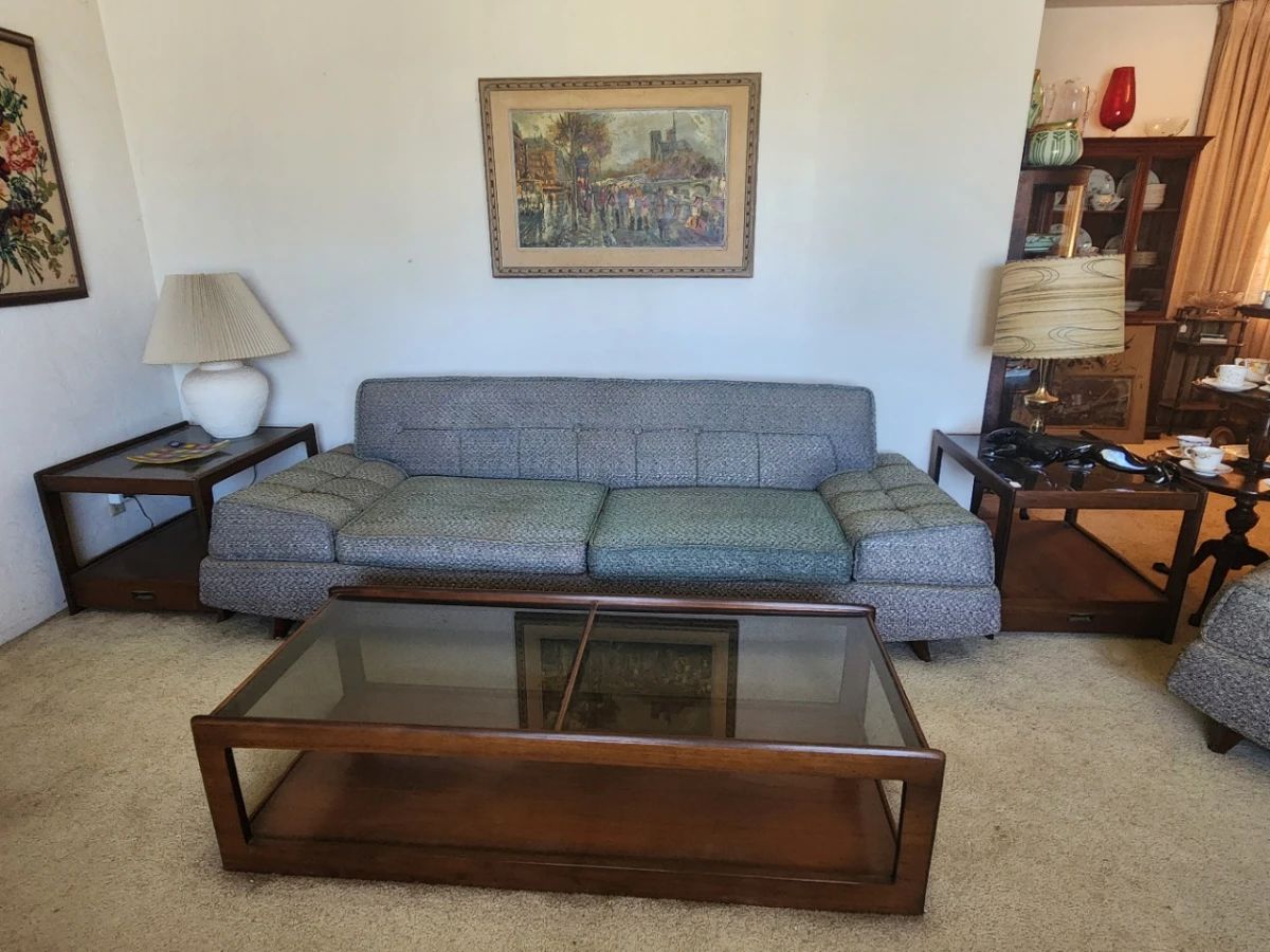 All contents of Kingsburg home. Antique bow front china cabinet, oak drop front desk, mahogany dining table and china cabinet,1950's Kroehler Atomic sofa and chair, leather sofa, MCM walnut & smoked glass end tables and coffee table, side chairs, vintage lighting, chrome kitchen table, Fostoria Colony crystal, Depression glass, pattern glass, silver, jewelry, kitchen collectibles, Wagner Magnalite, cast iron, vintage pottery, figurines and Mid Century decor, Haviland china set, Bohemian china, nice Lionel train sets and track, dolls, 1950's Murray wagon, old posters, calendars, books, sheet music, antique linens and quilts, framed needlepoint, sewing machine, old tools, fishing poles, Del...