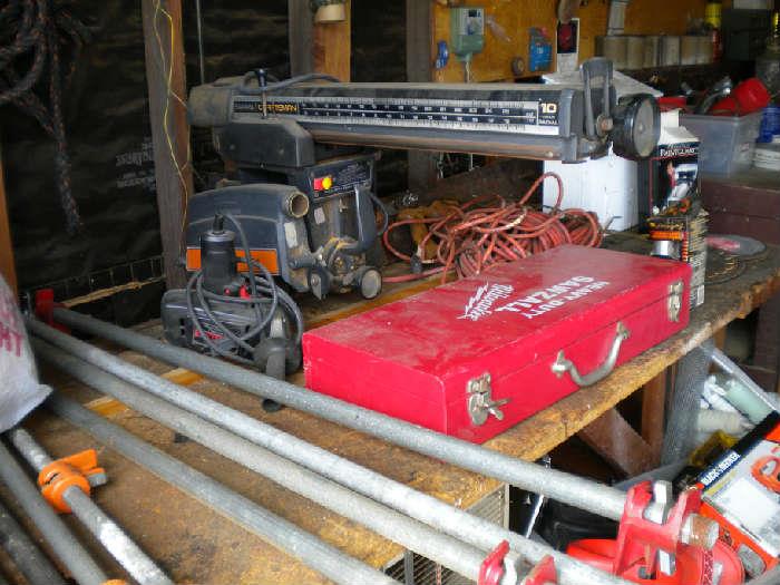 Lawndale Sale! Garage is full of great vintage stuff! Vintage work benches, Vintage Metal lockers, Black and Decker jigsaw, Craftsman 10" Radial saw, Heavy duty sawzall/Milwaukee, Craftsman tool chests, craftsman tools, Plumbing snakes, plumbing accessories, vintage vice, wood clamps, craftsman sander, craftsman drills, lots of handtools, gardening tools, "Toro" 6.75 lawnmower, workforce sawhorses, wood and metal ladders, door springs, power trimmer, and boxes of assorted garage paraphenelia. Shed is full of roofing material. Double hung windows. Vintage Christmas ornaments, santas, decorations, and trim. Vintage records, Kenmore sewing machine in cabinet, Necchi sewing machine in cabinet. Great collection of puzzles. Vintage...