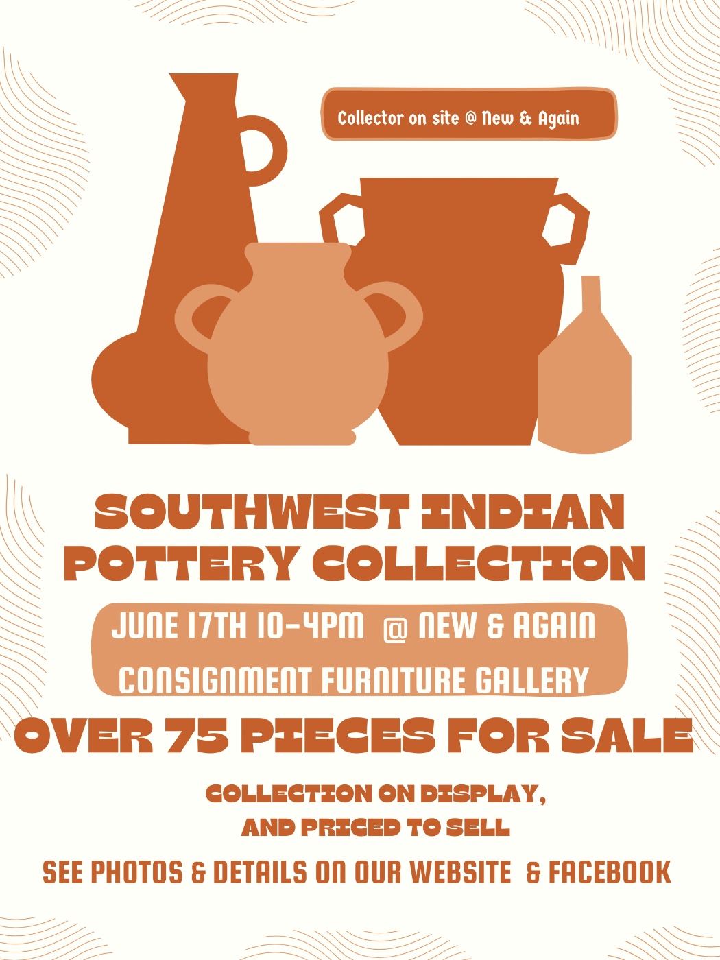 Roger Gearhart has been a long time collector of fine New Mexico Indian pottery. He is now offering his collection for sale at prices well below market value. He is knowledgeable with southwestern Indian pottery and has many friends at several of the eight northern New Mexico tribes. His collection will be on display at New And Again on Saturday, June 17 from 10 AM to 4 PM. Roger will be there to talk about pottery.
