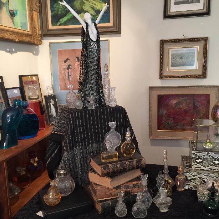 A wonderful opportunity to purchase vintage and a unique extensive perfume collection. Boxes and boxes of gorgeous crystal and colored crystal bottles. A long and notable list of Designer perfumes. to name only a few: Schiaparelli Shocking, L' air du Temps Lalique, Guerlain Sharlimar, Jean Patou, Joy Sublime, Vicky Tiel, Versaces, Paloma Pissaso, Prince Machibelli, Dior, Salvador Dali, Arpege Lanvin, Ungaro, Valentino, Nina Ricci, Jean Paul Gautier, Lucien Mon Amour, Wings, Vivienne Westwood, and too numerous to list all of them! We also have an extensive collection of Minatures. A beautiful collection of atomizers! Colored glass, Crystal and more! Costume...
