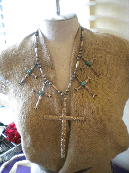 Charming home is Long Beach filled with Americana and Primitives and a collection of Sterling Silver Jewelry, Antique gate leg table. Drop leaf tables. Rustic tables. Collection of electic chairs. Stoneware. Stoneware large bowls. Blue willow dishes. Ironware. China.Beautiful selection of antique quilts. Handpainted furniture. Antique secretary. Antique dry sink. Antique Hoosier. Antique dressers. Antique twin bed frame. Gorgeous collection of vintage Native American Sterling, Zuni and Navajo necklaces, turquoise earrings, coral rings, turquoise rings, Sterling bear claw cuffs, some signed pieces. Sterling squash blossom necklaces! Beautiful vintage squash blossom necklace signed "Kenneth Begay" Great collection of costume jewelry, necklaces,...