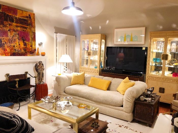 Miracle Mile home filled with vintage treasures and art. Some of the items you will find: Art: Kenny Scharf, Peter Max, Christiane Kubrick, Christoph Schmidberger, Brian Niebauer, Richard Hunt, Grant Shaffer, Yousuf Karsh, C. Summers, George Schwacha, S. Huerta, J. Flisak and so much more. Furniture: Mid Century vinyl chairs, mid century dresser and nightstands, antique campaign chair, Henredon cabinets, Brass and glass coffee table, vintage desk chair, Mitchell Gold + Bob Williams sleeper custom sofa, 1960s desk on castors, antique Chinese cabinet, mid century furniture. Miscellaneous: Sculptural lucite pedestal, 19th century Japanese hibachi, Curtis Jere sculptures, lamps a plenty,...