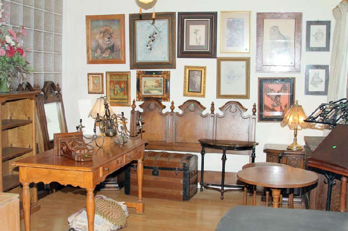 This is a home full of the life long collection of an actor. Antiques, Never before seen, Victorian furniture and Trunks, beds, camel back sofas, tables, highboys, wardrobes, dressers, buffet's, etc! lighting and lamps, paintings, prints, lithographs and other art, Blenko glass, 50’s Poppy Trail by Metlock china set, Masonic items, Carnival glass, milk glass, depression glass, French frosted glass figural stemware, silver plated flatware, brass and copper, wooden objects, Spanish colonial revival bedroom set, large stained glass coffee table,, big mid-century room divider screen, Lovely overstuffed wingback armchairs, vintage 60's sofa, Victorian Hall tree, Antique trunk, frames, other furniture,...