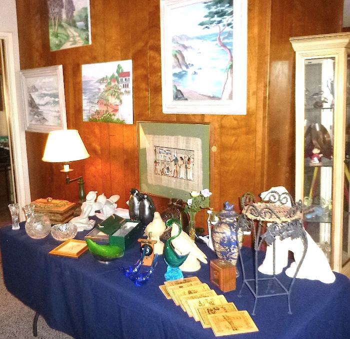 GREAT MANHATTAN BEACH SALE IN THE TREE SECTION! FULL HOUSE! FINAL DAY SATURDAY! HUGE DISCOUNTS UP TO 75% Greetings again! We are just getting started on this sale in Manhattan Beach so more pics and info will follow over the next few days. Just about everything here including furniture, housewares, collectibles, artwork, sets of flatware, stemware, crystal, art supplies, some tools, vintage bar, Benchcraft set of sofa and chair/ottoman, lighting, curio cabinets, woodblock prints from the Philippines, craft supplies, picture frames, some Xmas,, some jewelry, dining room table & eight chairs, art books, postcards, travel books, Waterford pitcher, Comoy walking...