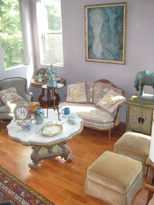 OUTSTANDING COLLECTION WITH AN ARTISTIC WHIMSY FLAIR BLENDED WITH QUALITY ANTIQUE FURNITURE & ACCESSORIES. CONSISITING OF A GORGEOUS 19TH CENTURY FRENCH MARBLE TOP PARLOR TABLE, 1800’S EMPIRE DAYBED & RECAMIER, EARLY LEMON GOLD EMPIRE MIRROR, VICTORIAN WALNUT PARLOR TABLE, 2 19TH CENTURY ½ RD WALNUT TABLES, BEAUTIFUL BURL WALNUT BREAKFAST TABLE, 1920’S FRENCH LOVESEAT, SET OF 6 CONT. COUNTRY FRENCH DINING CHAIRS, COUNTRY FRENCH OCCASIONAL CHAIR, RENAISSANCE REVIVAL VICTORIAN DROPFRONT DESK, EDWARDIAN DROPFRONT DESK, ART NOUVEAU SIDE CHAIR WITH INLAY, VICTORIAN WALNUT ARCHED MIRROR, 3 DIFFERENT IONIC COLUMN STANDS, EARLY COLONIAL WINDSOR ARM CHAIR, OIL PAINTING BY PEITER VONVELZEN, SEVERAL...