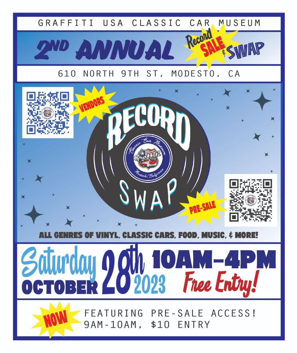 2nd Annual Record Swap, Saturday, October 28th, 10AM-4PM (FREE PUBLIC ENTRY) at Graffiti USA Classic Car Museum The 2nd Annual Record Swap at Graffiti USA Classic Car Museum is a must-attend event for music enthusiasts and collectors. This event brings together a diverse community of vinyl lovers, offering a unique opportunity to buy, sell, and trade records of various genres and eras. We will have over 40 tables of Vinyl, including LPs, 45s, and 78s. Attendees can immerse themselves in the vibrant atmosphere surrounded by classic cars and the nostalgia of vinyl records. Whether you're a seasoned collector or just...
