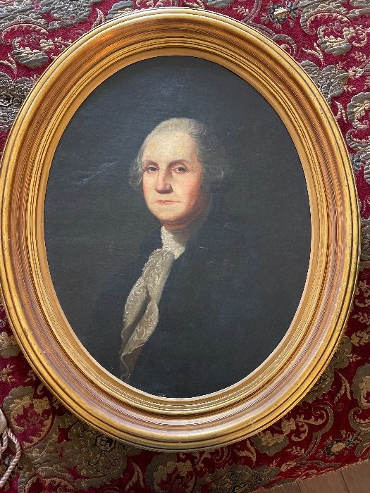 Out of the Georgian or Victorian Period comes an amazing oil on canvas portrait of George Washington, presented on era appropriate wood frame and canvas, and mounted using 19 th century methods. There seems to be no signature, but the school of Gilbert Stuart can very well be in play. Worthy of a museum, this is a piece you have to see up close to appreciate. Once there, you will be pleased by the many fine items for sale: lots of fabulous furniture, such as the monumental King size rice bed with matching nightstand and TV armoire, beautiful Louis XV...
