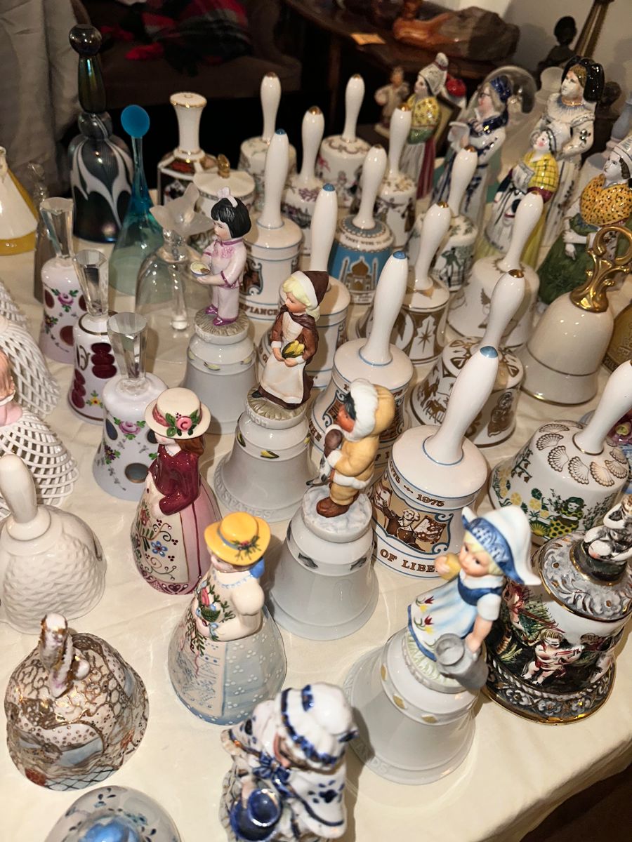 huge bell collection, antique porcelain nodders, die cast car collection, dreidel collection, Pinocchio collectibles, crystal collection, ephemera, iron cast coin banks, coin mint sets, men’s clothing, garage and much more.