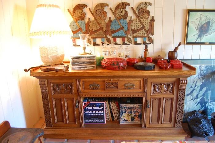FABULOUS ESTATE SALE IN OJAI! Begins Friday, October 2nd through Sunday, the 4th. Open 9-5 Fri. & Sat.; 9-2 on Sunday. Beautiful antiques; wall shelf with hand painted stem ware, National Store fan scale "Pennsylvania Special", cobblers bench with shoe forms, apothecary bottles, gorgeous oak sideboard, display cabinet, dictionary stand in great shape, captain's chest, globe on stand, cut crystal, stuffed pheasant. Large selection of hand made, appliqued pillow covers, mostly oriental designs by local artisan and original homeowner! Art collection featuring range of styles from figure painting, abstracts and seriagraphs; listed artists include:, Mary Michel, Roberto Lupetti, P.X. Nidorf,...
