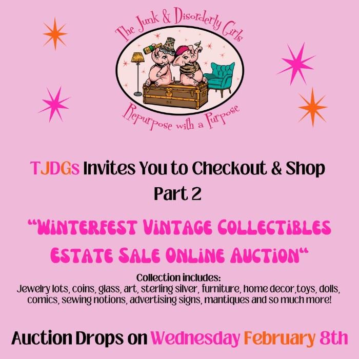 TJDGs Invites You to Checkout & Shop our "Winterfest" Part 2 Vintage Estate Sale Online Auction We've been busy curating a fun collection for a group of seniors from a local retirement and active living community here in Palo Alto! This collection features a lot of art, antiques and collectibles, MCM, jewelry lots, (some QVC collection pieces) sterling silver, Waterford, coins, glass art, furniture, Barbies, toys/dolls, (Rare Beanie Babies) sewing notions, French Children's books, mantiques and so much more! We’ll be dropping new items daily until our auction closes, so make sure you keep checking back to see what new...