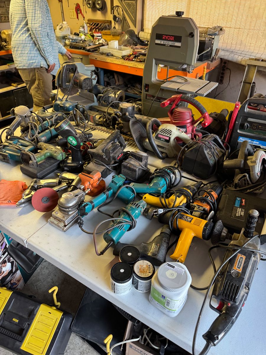 This house is stuffed with cool finds! Garage is filled with tools. Some tools to be found: metal-arc welding power source, Corded Electric Chipper Shredder, Ryobi 1.2 Amp 16-inch corded scroll saw, portable oxy-acetylene torch set, portable electric air compressor, Coleman Vertex 7500 generator, Ryobi 9-inch band saw, Professional Powerstation PS1100, various hand tools, power tools, and lots more! Kitchenware: Pyrex, depression glass, cookie jars, pots & pans, glassware, flatware, dish sets, a few pieces of uranium glass, silver plated items, etc. Decor: lamps, MCM decor, mirrors, artwork, tang dynasty war horse sculptures, religious hand carved wooden wall hangings, collection...