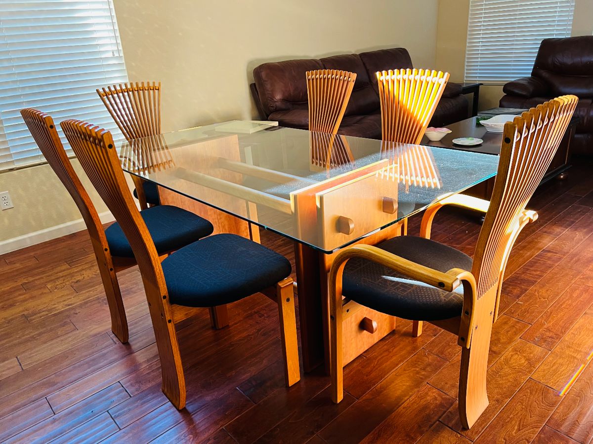 - Danish Modern Teak Dining Table W/ 6 Fan Back Chairs