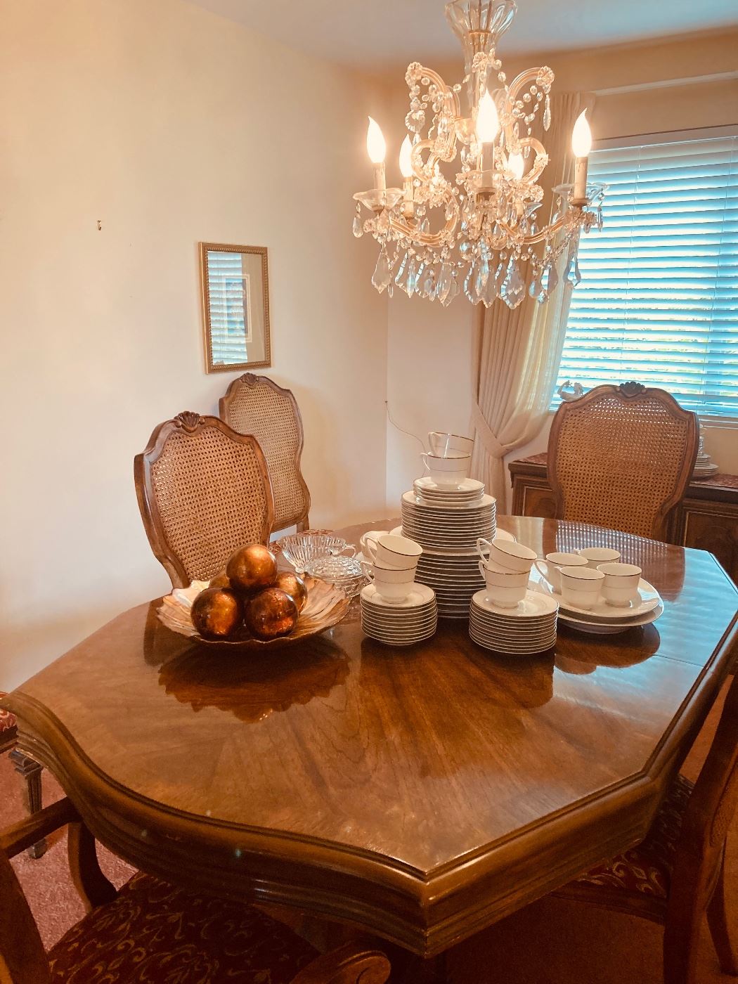 Vintage Dining Table And Cane Back Chairs. Off White Shabby Chic Kitchen Table with Rush Seat Chairs. Vintage Buffet. French Provincial Style Bedroom Furniture. Potted Plants. Lladro Fifurines. Kingsize Bedframe. Full Size Bed. Bedding g. Linens. Decorative Wall Clock. Display Cabinets. Vintage Speakers. Floral Couch. Framed Artwork. Set of Stoneware Dishes. Kitchen Pots And Pans. Blender. Large Vintage Wood Drawer Cabinet. Toaster Oven. Entryway Cabinet. Parlor Chairs. Cane back Sofa. Vintage Inlaid Wood Cabinet. Office Desk. Daybed. Tufted Chair and more…