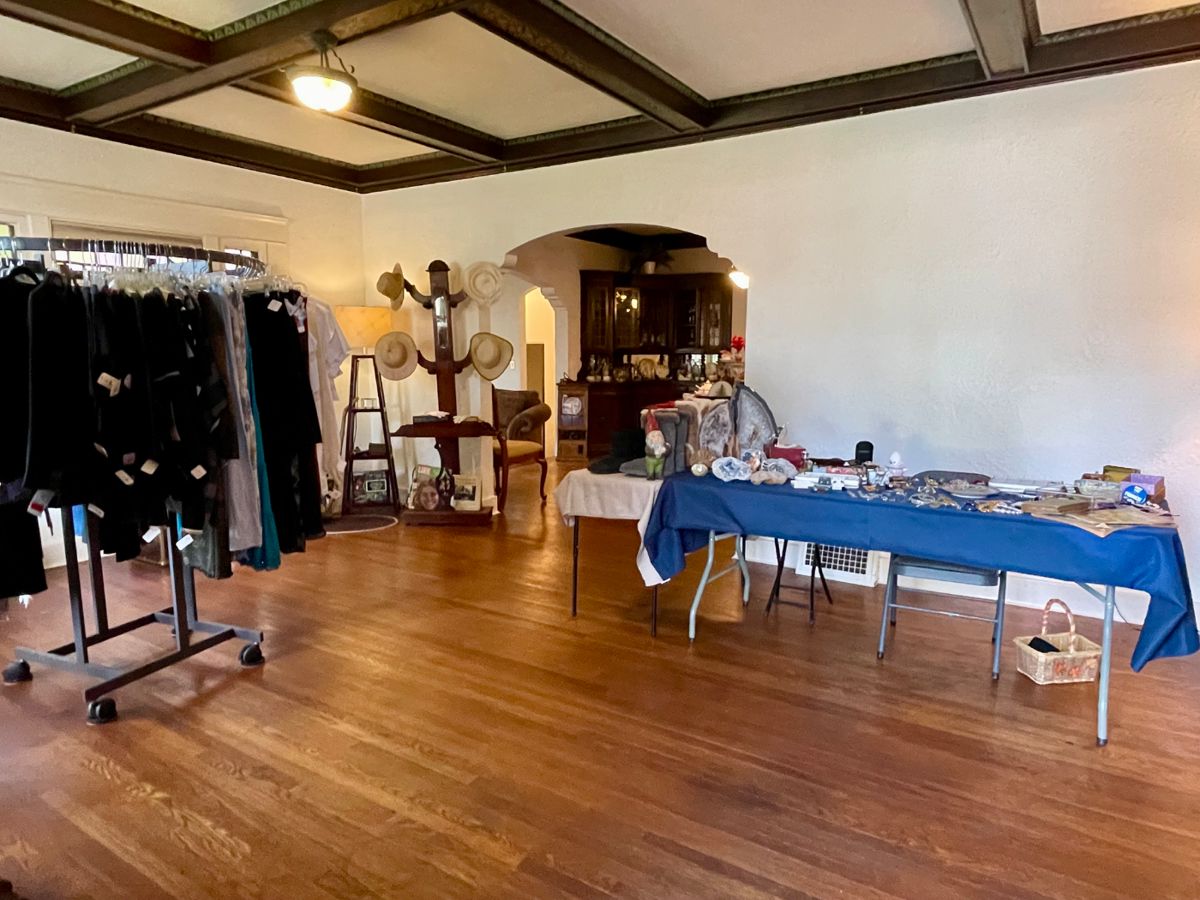 Hello! Thank for attending our previous sale! We have another awesome two-day estate sale starting Saturday! This is a beautiful home built in 1909! Starting off in the living room we have women's clothing and shoes from quality brand names! We have costume jewlery, Geodes, UGG Boots, swimwear, vintage clothing, vintage blue recliner, umbrella and hat rack, and so much more! In the dining room we have a beautiful drop leaf dining table with includes eight chairs, table extensions, and pads. We also have Christmas china, crystal, vintage dishes, tea cups, metal corner shelf, glass top coffee table on casters...