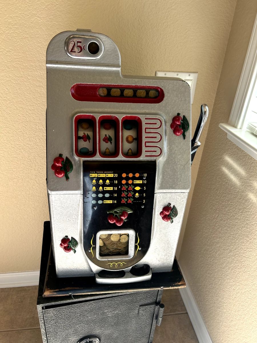This sale is full of the normal household stuff, plus so many other items one might not expect! Included: Antique Mills 10 cent Black Cherry slot machine- in working order!, Antique Seth Thomas mantle clock and other wall clocks, Winchester full size vertical gun fire safe (20 long gun capacity, 30" @ 1400 F), 65" OLED Sony smart tv (1 year old!), Lots of kitchenware, knick-knacks of all kinds, Many rooster- related ceramic items/decorations, Beach/sea decor, Patio furniture/yard art, Vintage items such A & J Uranium green glass eggbeater, metal/wood coffee grinder, Pelouze 60 lb scale, aluminum miners lunch box,...