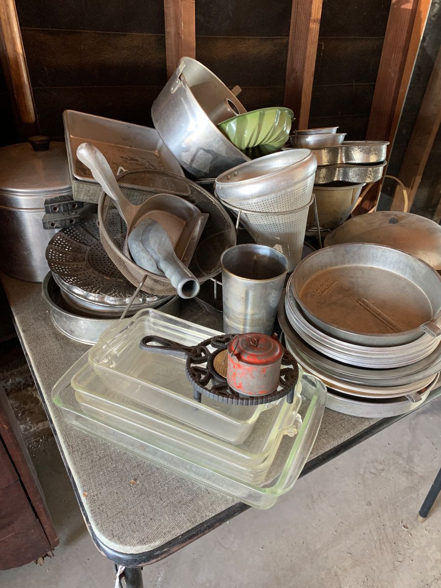 Tons of antique books, old games, 2 old Singer sewing machines, all types of sewing stuff, loads of antique furniture, old China, stoneware, sterling silver, old tools, lawn mower, bar ware, Christmas, Halloween, tons of cookware, antique lamps, old oven, metal desk & cabinet, 2 antique cupboards, vintage high chair & stroller, old records, old galvanized buckets, tile, old trunks, old radios and camera stuff, jewelry, old mannequin, vases, glassware, old Tupperware