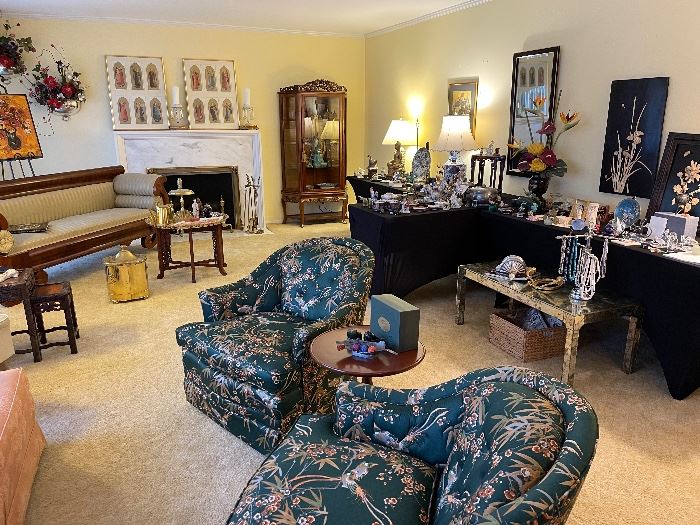 This Mid Century Marvel of a home (which will be for sale!) features a collection of Tibetan, Indian & Hindu Buddhas, Chinese and Japanese bronzes, Porcelain, Chinese wood carvings, Silk Textiles, Japanese & Chinese Scroll Paintings, Bone carvings, Chinese rosewood nesting tables, Victorian Furniture (a sofa YOU must see!) Mid Century Patio furniture, Blenko glass collection, vintage designer clothing, purses (size 14-16) and jewelry. Herrend, Hutschenreuther, wood carvings, brass, glass, JBL speakers, washer, dryer, fridge, wall unit, oh and THE lamps! If you had one sale to go to this is THE ONE.