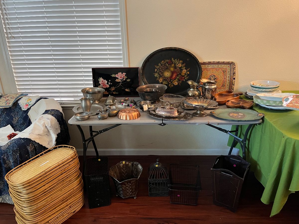 Antique furniture, dishes, glassware, pewter, silver, decorative items, holiday decorations, jewelry, electronics, art work, frames, lamps, kitchen items, pet crate and gates, books, garden pots and tools, and patio furniture.