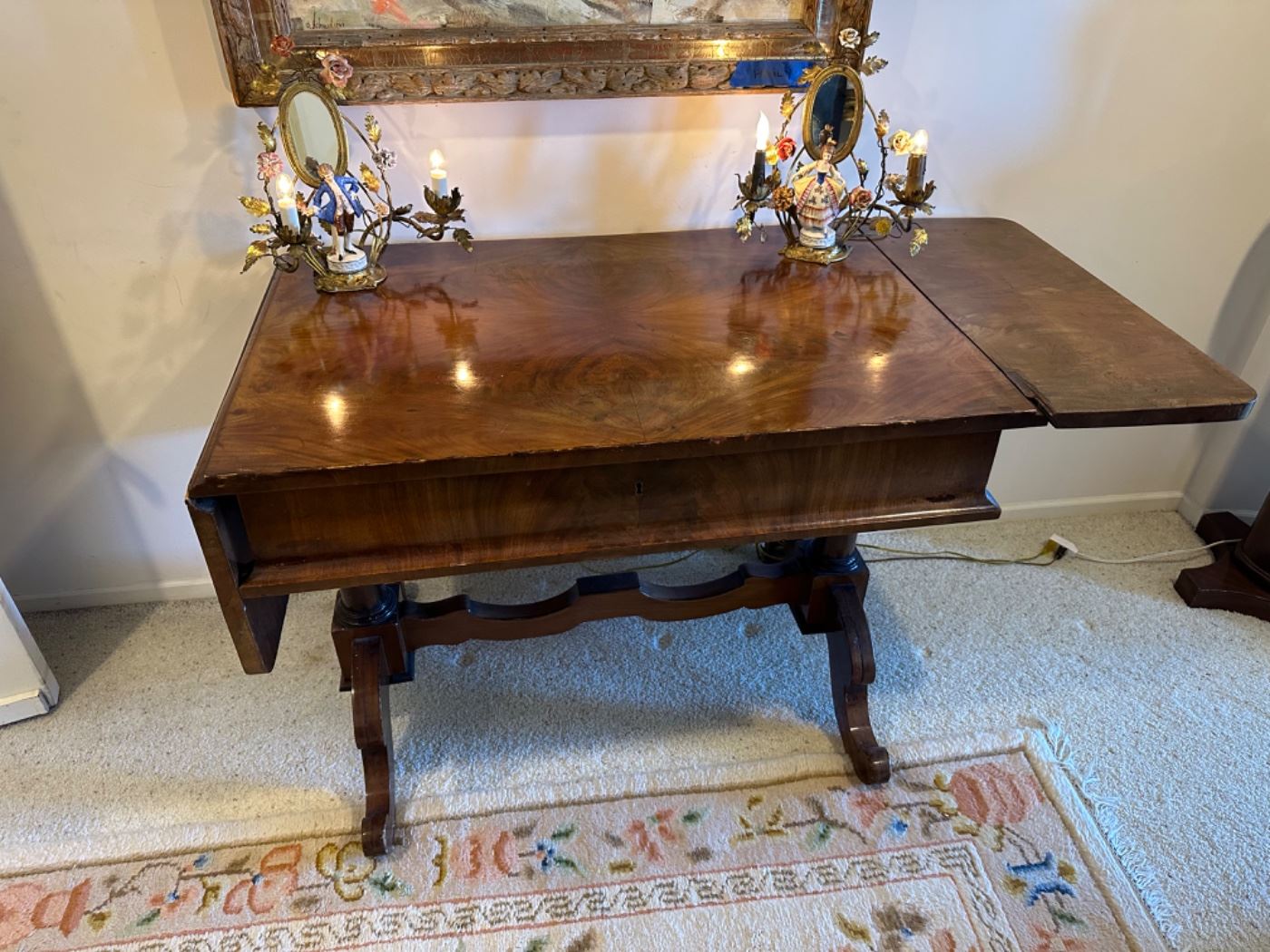 A lovely Collection including: Large Walk-in Closet Full of Women’s Clothing: Vintage Blouses, Slips, Sweaters, Dresses and Pants. Full Length Mink Coat. Many Shoes & Purses. Hats, Hankies. Over 50 Scarves. Baldwin Baby Grand Piano. Lovely Dining Table & Chairs. Matching Buffet. Gorgeous Set of Vintage Salmon Pink Silk Chairs with Wrought Iron. Vintage Bar Cart. Antique Tables: 19th Century Table with Drop Leaf Sides (a perfect serving table). Antique Dresser with Mirror. Large French Entryway Mirror and French Rococo Console. Nice Pair of Blue Velvet Loveseats. Vintage Leather Top Desk. Gold French Vitrine Curio Cabinet. Many Carved Wood Chairs....