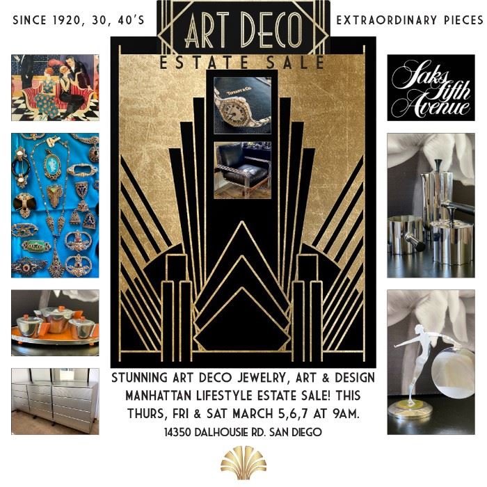 SELECT JEWELRY AND FURNITURE - 30% OFF TODAY! Hello Estate Sale Friends! The sale we have for you this week will leave you simply SPEECHLESS! Firstly, we have never before had such an amazing Art Deco Collection! And we have art deco EVERYTHING! JEWELRY, ART, BARWARE, BOOKS, STATUARY, COLLECTIBLES ETC.. There is a 2014 Mercedes Benz with only 28,000 miles on it! I will include more pics on the car tomorrow. It has tons of options and is immaculate! The owner will be on hand to test drive and discuss with anyone who is interested. It is OWNED not leased....