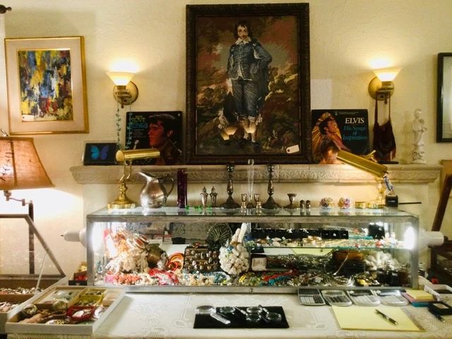 This Rose Garden Home is Filled with Many Years of Collecting! Gold, Sterling, Fine Jewelry, Native American and Mexican Turquoise and Silver Jewelry and Accessories! 28+ Trays of Designer Jewelry, 3 Cases of Navajo, Indian, and Mexican Jewelry Fenton, Noritake, Franciscan Desert Rose, Flintridge by Marquis, Golden Crown Bavarian, Depression, Lots of Handblown Glasses. Religious Items, Carved Masks, Mah-Jongg Set. Lots of Art, and Art Glass, Woodblock Prints, Pottery. Furniture Includes Wing-Backed Chairs, Brass & Glass Coffee & End Table, Asian-style Benches and Tables, Pie Safe, Magazine Holders, 2 Floor-Standing Jewelry Cabinets, Office Armchairs, Bookcases, Wooden Trunks, Antique Spool Bed...