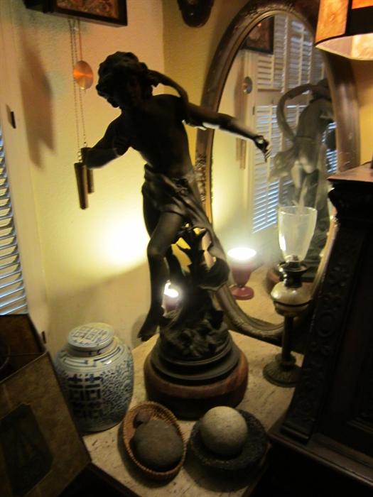 AN ESTATE COVERING A VAST VARIETY OF ANTIQUES AND COLLECTIBLES CONTINENTAL PATINATED SPELTER SCULPTURES., 23 BLACK FOREST CARVED LINDENWOOD CUCKOO CLOCK, AN AMERICAN AESTHETIC MOVEMENT OAK HALL TREE., MINERAL SPECIMENS, AN AMERICAN FREE-FORM EDGE REDWOOD LOW TABLE., PAPERWEIGHTS, BURLWOOD AND DRIFTWOOD PIECES., AN ENGLISH BRASS AND MAHOGANY ROUND WALL CLOCK, A GERMAN RENAISSANCE REVIVAL MANTEL CLOCK, MANTEL CLOCKS, MISSION OAK WALL CLOCKS., NATIVE AMERICAN BASKETRY, BLANKETS, EARLY STONE UTENSILS, POTTERY., AMERICAN LEADED GLASS WINDOWS., VARIETY OF OIL PAINTINGS, WATERCOLORS, LITHOGRAPHS, PRINTS., GERMAN STEINS., LEADED GLASS HANGING LAMPS, ARTS AND CRAFTS GLASS AND METAL LAMP SHADES, BANKERS LAMPS, MID-CENTURY MODERN LAMPS.,...