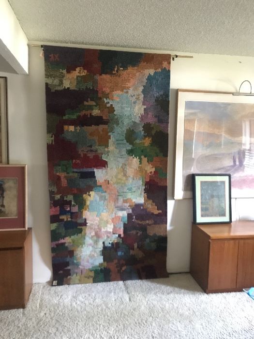 Great Selection of Of Framed Artwork. Large Statement Canvases. Gorgeous Vintage “John St. John” Woven Wall Hanging. MCM Style Display Cabinet. MCM Storage Cabinet. 40” Flatscreen TV. Full-size Bedframe. Asian Style Bedroom Set. Bookcases. Vintage Furnishings. Eclectic Mix. Student Desk. Table and Floor Lamps. Pottery. Ceramics. Bookcases and more! Digger Sale in Garage! Come check out the sale! Thanks!