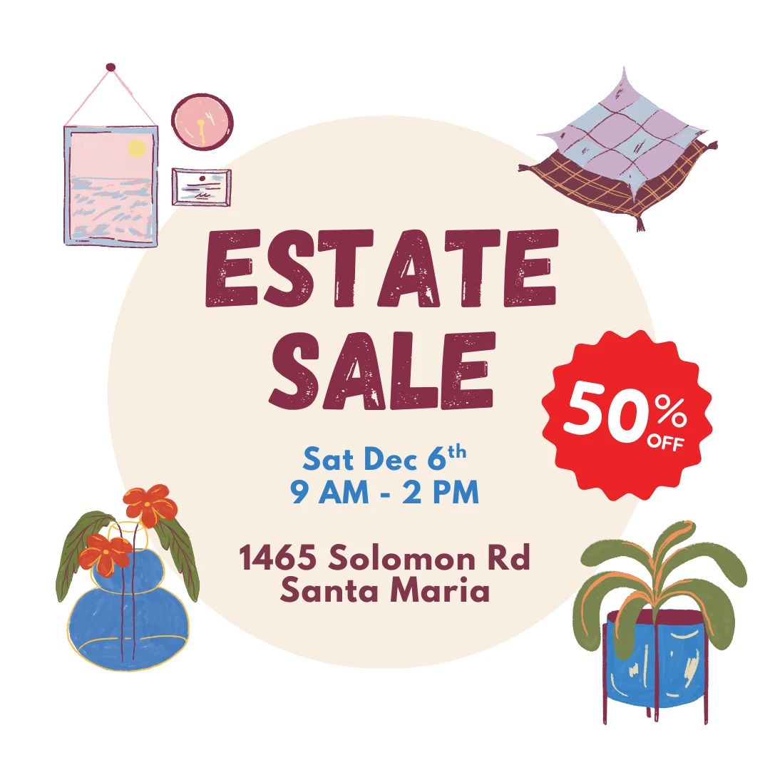 Saturday is 50% OFF the entire estate sale at this Santa Maria home filled with decades of collecting, unique vintage décor, and hard-to-find treasures. Every room and corner has something special to take home! 🕘 9 AM – 2 PM 📆 Sat, Dec 6th 📍 1465 Solomon Rd, Santa Maria ✨Highlights: Vintage décor, clocks, lamps & unique home accents Large salt & pepper shaker collection Hot Wheels, Tonka, & other vintage toys Glassware, crystal, pottery & kitchen items Books, vinyl records & framed art Golf clubs, fishing poles & baseball gloves Vintage surveying tools & other collectibles *Driving Notes* Please...