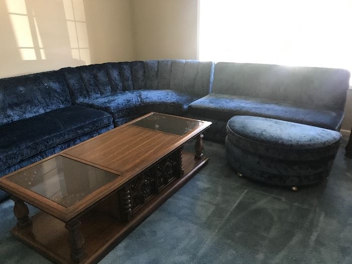 Funky Deep Blue “Hollywood Regency” Style Sectional Sofa. Vintage Italian Chandeliers. Glasstop Tables. Upholstered Bench. Metal Workbench. Metal Shelves. “Remington” Typewriter and Cade. Small Glassfront Cabinet. Vintage Storage Trunks. 60” TV. Lots of Christmas and Decorative Treasures. Porcelain Figurines. Roof Rack. Vintage Dinnerware “China.” Selection of Silverplate. Glassware & Crystal. Metal Cocktail Cart. Vintage Zenith Stereo Console. Leather Chair. 50’s Linoleum Table. Tools. Metal Toolbox. Rectangular Glasstop Patio Table and Chairs. Vintage Glassfront China Cabinet. Vintage Dining Table and Chairs. Occassion Tables. Vintage Large Blue Glass Table Lamp and more! Come by the sale! Thanks