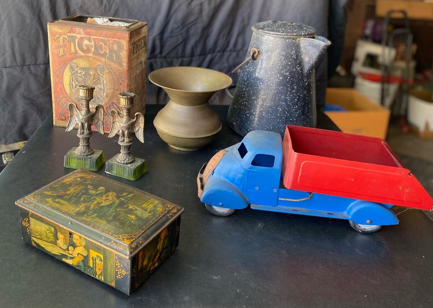Now that the 4th of July excitement is over let's start the month off with a "Blast of Vintage" estate sale in Signal Hill. This sale has the following items up for sale: oak roll top desk, antique wall clock out of the Carson City Bank, Red leather couch and ottoman, cut glass decanters, ephemera, radio, Civil War era blanket chest, Pre-Depression Glass water pitcher and glass set, red glassware, tin, coffee, pitcher, antique cut crystal, kitchen clock, mantle clock, Dresden Meissen candlesticks, True Tone Radio (1940's), vintage toy trucks, Banker's lamps, brown trunk, ceramic faces, oak Biscuit Barrel, hat...