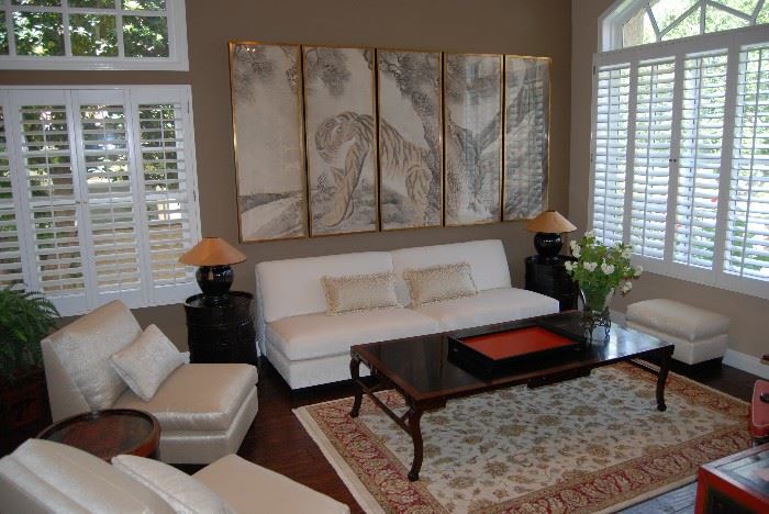 Friends, This is your opportunity to save up to 50 - 60 - 70% off the price of designer furniture, furnishing, carpets and antiques from Ethan Allen, Charles Jacobsen Antiques, Atelier Katayon etc. We are selling the contents of a beautiful Westlake Village residence this Saturday and Sunday... Partial listing of items to be sold: 19 th Century Japanese painting of a Tiger – 5 sections in all of museum framed artwork 19 th Century Chinese Blackwood daybed ( currently used as a coffee table) Handmade Kashan rug, red loomed wool carpet land white sand carpet from Ethan Allen, Pair...