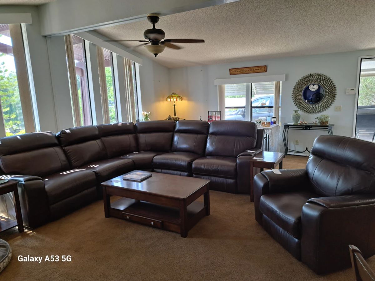Lots of tools, potted plants, leather electric sectional couch, lots of Christams and household goods.
