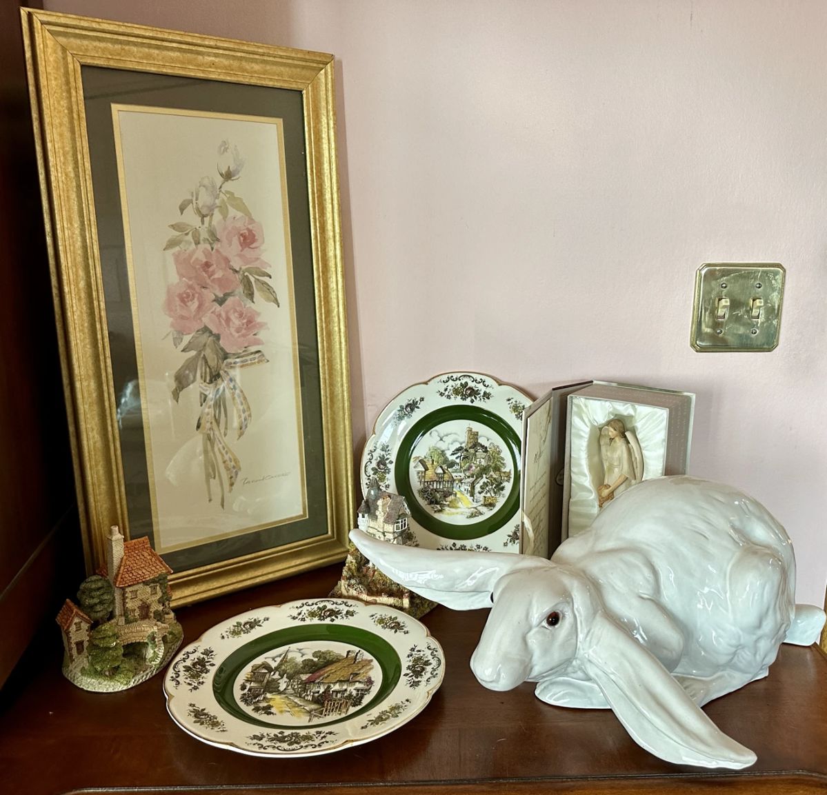 Awesome Assortment in Arvada Vintage Squash blossom necklace, Turquoise jewelry, Costume jewelry, Table lamps, Cherry China hutch, White iron stone pieces, Curio Cabinet, Bassett Floral couch and loveseat, Boyds bears and friends figurines, Liliput Lane cottage figurines, Collectible plates, Super eight viewer, JVC video recorder, Magnavox stereo side table, Dual Eight cartridge projector, Binoculars, Large wood armoire with matching side table, Storage bookshelf, Lladro figurines, Rabbit decor, Wall decor and art, Vintage Indiana glass Tiara pattern Amber - many pieces, Round kitchen table with chairs, Windsor chairs with matching table, Small kitchen appliances, Vintage western electric telephone, Brass tea pots,...