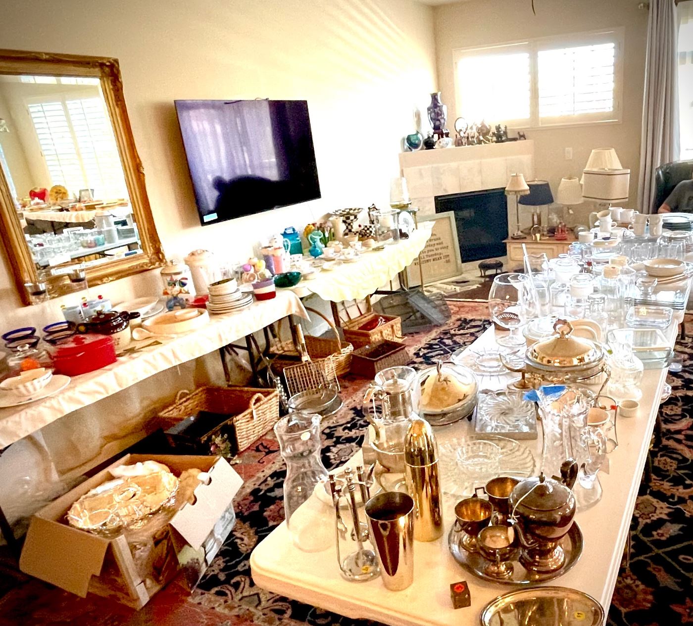 This estate has many wonderful collections from worldwide travels, — — fine stemware, china, fur coats, furnishings, antiques, art, vintage decor, mirrors, designer clothing and gowns, high end household design decor and much more. See photos below for room by room sales tables.