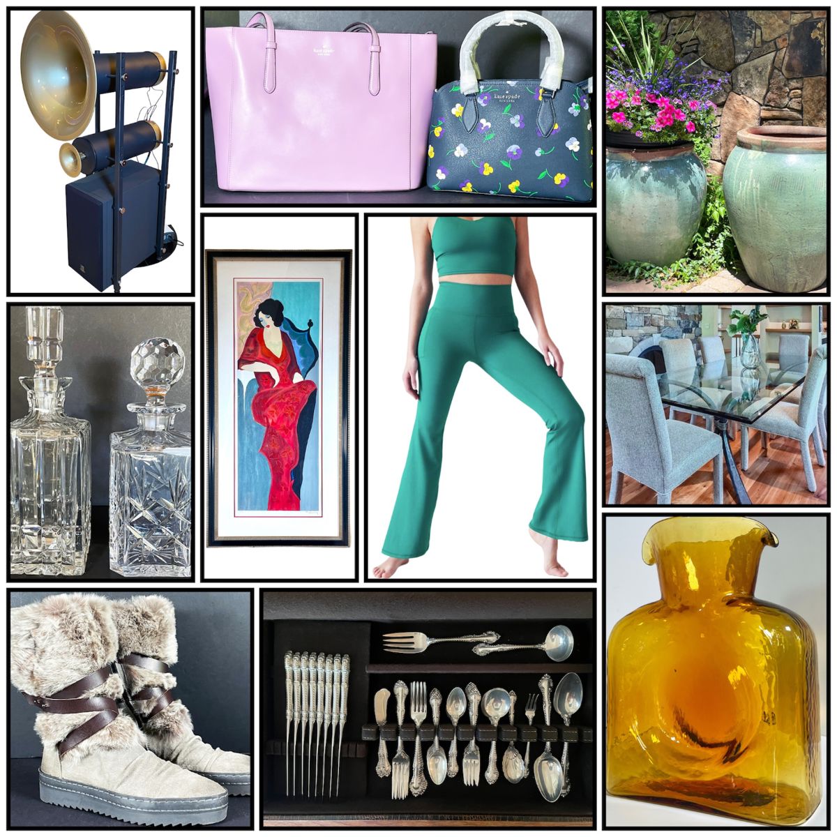 Our client is downsizing and selling high end audio, custom made furnishings, sterling silver flatware, a collection of Kate Spade bags, and other designer clothing like Athleta, Title Nine, Anthropologie, Patagonia, & more. Everything is high end! 10 Sweet Vintage Cocktail Glasses With Cocktail Shaker Revere Silversmiths Weighted Sterling Compote Dish #905 As Is Assorted Silver Plate Items Including Large Ornate Tray Antique Alvin Sterling Flatware Majestic & Orange Blossom Patterns Lovely Gorham English Gadroon Sterling Flatware Set For 8 3 Lifetime Folding Tables Lovely Large Scale Linnea Pergola Signed Serigraph Old Ball Game Double Matted And Framed Vintage Yamaha...