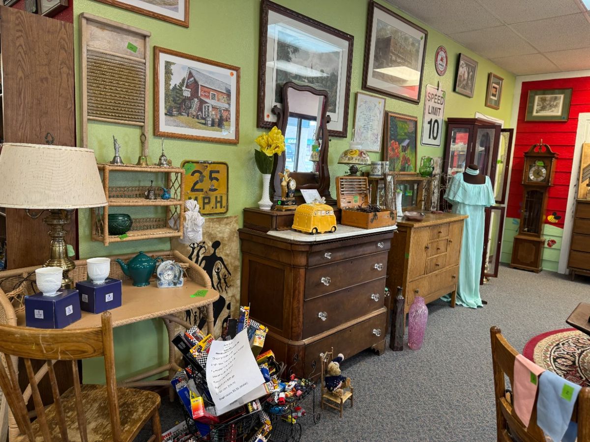 OPEN 10AM-4PM Tuesday - Saturday located across from The Omelette Parlor. Vintage and antique instruments including a fabulous MCM record player and an Edison Victrola. Tea Sets ready for a garden party, Jewelry of all kinds, Vintage and Collectible Comics and Magazines, Vintage Books, Colorful Glass, Boho wicker and bamboo furniture and decor pieces, Vintage Tins and Wall Signs, Vintage and Antique Furniture, Framed Artwork, and more!!, Tools, clothing (some vintage), light fixtures, etc.