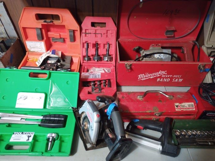 Packed full of tools from a lifetime building homes, teaching construction and commercial pipe installation. Nice selection of power tools, hand tools and home improvement supplies Commerical pipe cutting, threading equiptment and cutters. Dewalt, Makita, Rigid, Milwaukee and more! Wacker gas powered compactor Air compressor, arc welder, oxy/acetelyne torch Chainsaws, 3 1/2 ton car jack, ladders Lovely yard furniture set and fountain Camping equiptment and cast iron pots Bicycles, yarn, some books and knicknacks