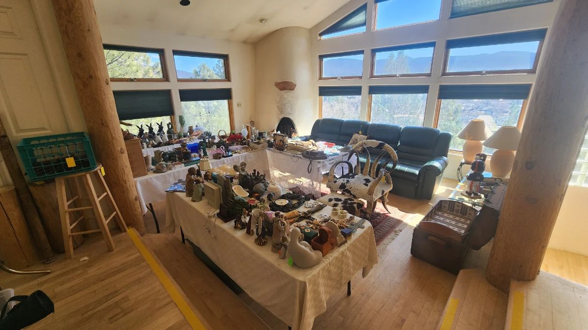 Welcome to another Four Corners Estate Sale! Right in town up on the hill by the Pavilion! This is a WOW Sale! There is so much stuff! Not just stuff, Quality things. LOTS of brand new with tags or in boxes VINTAGE clothes, collectibles. Lots of higher end sports, 2 great bikes, Leather reclining furniture. We literally have a big TOTE full of jewelry, much new with tags, but vintage! Some great pieces of very unusual furniture! There are 3 floors packed with things, also 2 patios and shed items. In the living room, there are tables of smalls, lots...