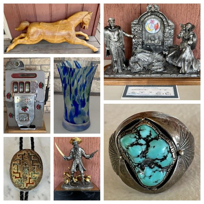 This is a truly magical sale with a large collection of Michael Ricker one of a kind Pewter signed and numbered Figurines, Mid Century Modern Furniture including Willett Transitional Solid Cherry Dining Table, Chairs, Breakfront, Peg Leg Desk with Bookcase, MCM Art Glass, Antique Silver lCoins, Gold and Silver Jewelry, Chinese Art, Pottery, Books, Dolls, Early Hummel Figurines, a Chinese Silk Two sided Embroidered Kitten in Antique Rosewood Frame, MCM Decor and Glassware, Lamps, Books, A Large Assortment of Vintage Games, Chess, Native American Jewelry, Bolo Ties, Rings, Kitchenware, Vintage Linens, Mirrors, Leather Suitcases, Satchels, Etched Brass & Copper from...