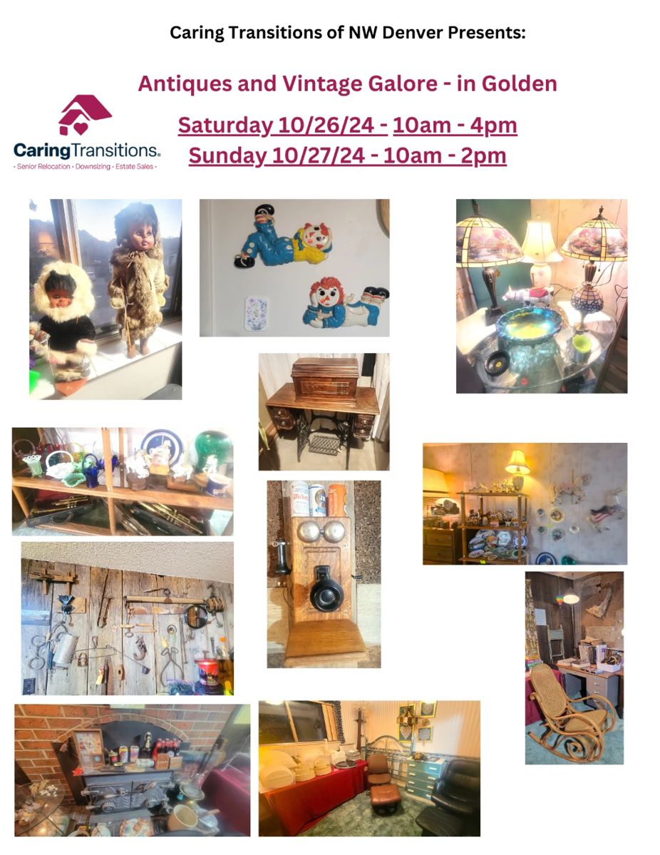 Caring Transitions of NW Denver Presents: Antiques and Vintage Galore in Golden! Saturday 10/26/24 10am - 4pm. Sunday 10/27/24 10am – 2pm. Everything MUST GO! The address will be shared Friday morning here. Vintage/Antique – Glassware, Décor, Toys, Dolls, Lamps, Camera’s, Camcorders, TV, Clothing, Shoes, furniture, linens, and more! Tons of kitchenware mostly new. Tons of Cake Décor. A lot of different collectibles. Tools, patio furniture, regular household items. There is something for everyone. Awesome unique Christmas gifts for the collectors in your family. More pictures being added on Friday. Hope you get to shop and enjoy what we have...