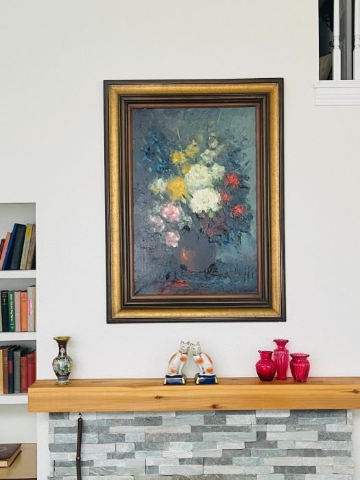 Flower Still Life Oil Painting In Frame Signed By Artist Hand Painted Gold Imari Urn Red Le Creuset Square Stoneware Casserole With Lid Wool Area Rug With Red/ Warm Undertones Georgian Chippendale Sligh Furniture Leather Top Writing Desk Assorted Cutco White Pearl Knives CUTCO Set Of 4 Steak/Table Knives #1759 - Classic White French Provincial Style Nightstand Sack Back Windsor Bench Victorian Style Silver Tone Hair Brush & Comb French Provincial Style Vanity & Matching Stool French Provincial Style Tall Chest Of Drawers Vintage Georgian Style Wig Stand Vintage Animal Design Bakhtiari Persian Wool Rug Vintage Cloisonne Floral Vase Set...