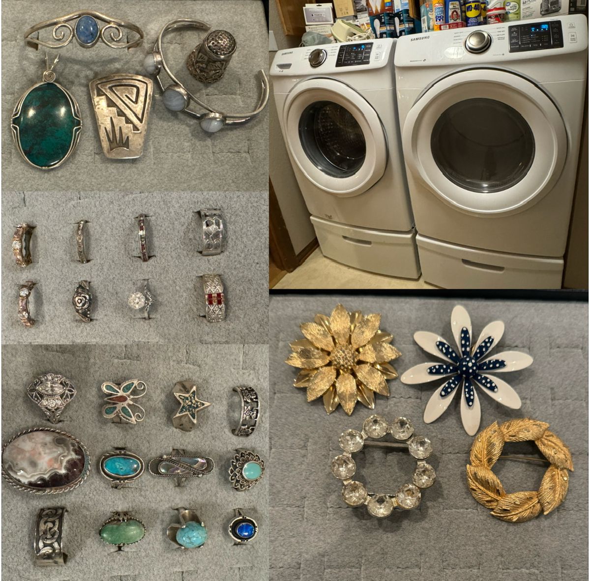 Items in home are: A lot of beautiful sterling jewelry Costume jewelry Ladders Quilts Blankets Clothing Jackets Scarfs Belts Pots and pans Pyrex Noritake China China hutch Dining table Round dining table Shelf Outdoor patio table Statues Outdoor patio chairs and end tables Rug Samsung matching washer and dryer set Dressers Sewing machine with table and stool bench Futon Suitcases Shoes Socks Bed Pictures Clock Sofas Recliner chairs Tv Tv stand Lamps Mirror Glassware Crystal Stereo console set with speakers CDs DVDs Books Towels Sheets Easter Xmas Chemicals Toiletries Paint Coolers Tools Shelf’s Shovels File cabinet Stained glass And so...