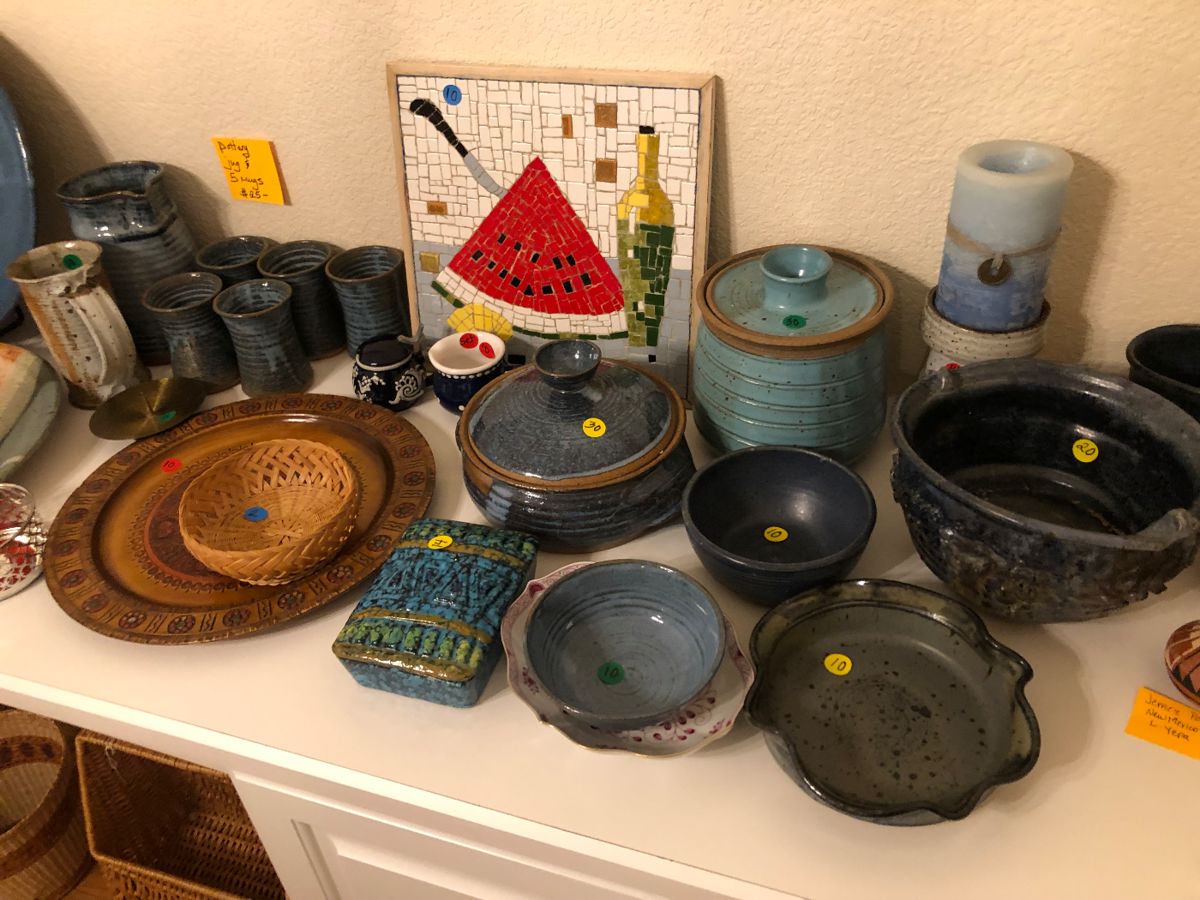 Lots of lightly used furniture priced to move. Beautifully pressed and clean linens (tablecloths, napkins, placemats runners, doilies). A shop within the home is filled with tools and hobby materials. Full kitchen with baking and cooking items, lots of dishes and serving pieces. Large collection of pottery. Garage packed with home essentials. Accepting offers on Stairway chair.
