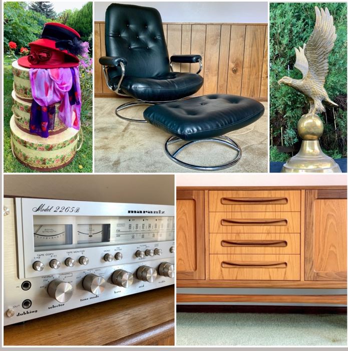 A fabulous Loveland home right across from the Lake! So many high-end mid century treasures--including exceptional electronics & speakers. Featuring: G-Plan Modular Leather Couch + 2 Extra Chairs Mid-Century Modern Danish Lighted Corner Cabinet Marantz Model 2265B Stereophonic Receiver With Box G-Plan Mid-Century Modern Quadrille Teak Nesting Tables Midcentury Glass Hutch With Bottom Glass Stereo Compartments G-Plan Mid-Century Modern Coffee Table Horse Bicycle Vintage Toy 1960's Black Leather Ekornes Stressless Chair 6 Mid-Century Modern Chairs Jemez Pueblo Painted Double Vase G Plan Vanity Dresser With Mirror 3 Wooden Antelope Figurines 4 Elephant Figurines 3 Small Brass Deer Figurines Large Lot...