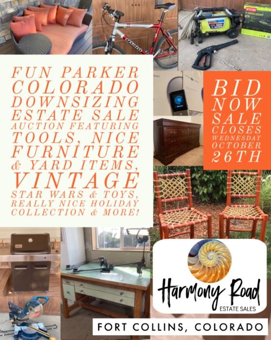 Fun Parker Colorado downsizing online auction estate sale featuring tools, nice furniture, yard items, vintage Star Wars toys, really nice holiday collection, baseball card collection & so much more! Click the link or go to harmonyroadestate.com to find out more.