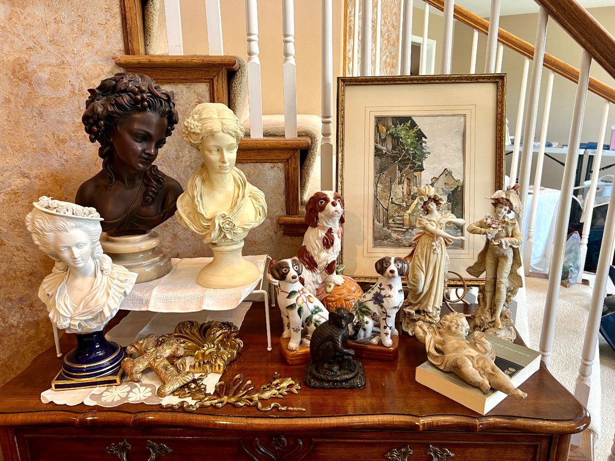 50% OFF SATURDAY! House full of beautiful and high end traditional home decor. Some antique furniture. Lots of newer furniture in the Queen Ann style. 2 grandfather clocks with handmade cases. Spode transferware dishes, cut glass and crystal. Full kitchen-countertop appliances, cookware, bakeware -lots to choose from. Leather sofa and loveseat. Large ottoman. Lots of candle holders, iron animal figurines, Delft, lots of figurines. 10 needle embroidery machine by BabyLock with lots of accessories and thread. BabyLock Serger with accessories and many spools of thread. BabyLock sewing machine with many accessories. Can also do embroidery. Upholstery fabric, lining, embroidery stabilizers,...