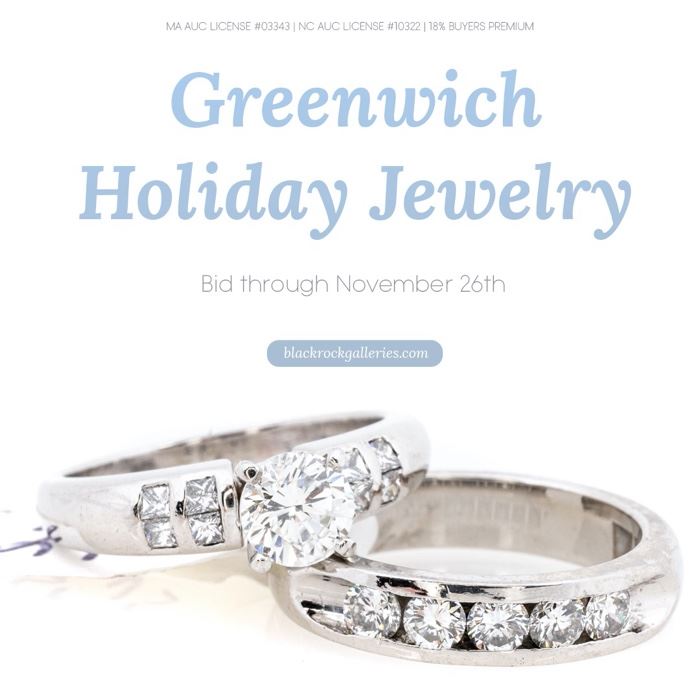 GREENWICH HOLIDAY JEWELRY SALE BEGINS TO CLOSE THU, NOV 26 AT 8:05 PM EST LOCATION: BRG GREENWICH 84 ITEMS VIEW ALL ITEMS, DETAILS, & BID ONLINE AT WWW.BLACKROCKGALLERIES.COM BRG is pleased to help you add some sparkle under your tree this year with this assortment of fine jewelry and high-end costume jewelry. Offerings include watches, 14k gold, sterling silver, diamonds, precious and semi-precious stones. Find special gifts and stocking-stuffers for loved ones, friends, and colleagues (or even yourself) just in time for Christmas. Happy bidding! VIEW ALL ITEMS, DETAILS, & BID ONLINE AT WWW.BLACKROCKGALLERIES.COM ***BRG warehouse-to-warehouse transports available (Bridgeport, Greenwich,...